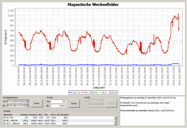 van het driedimensionale elektrische veld (50Hz) op zijn slaapplek.